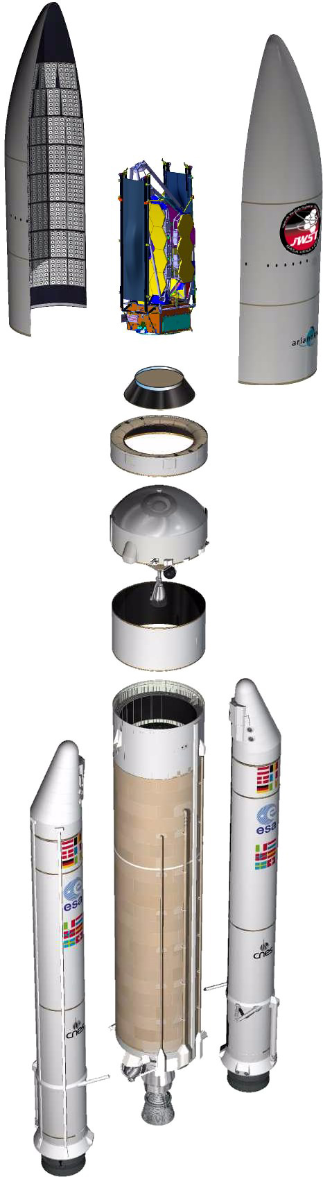 Para que el telescopio encaje en el cohete, debe plegarse. Estas imágenes, cortesía de ArianeSpace, muestran cómo encaja en el carenado del cohete.